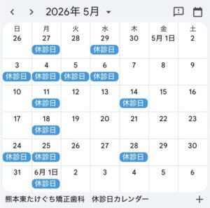 熊本東たけぐち矯正歯科の5月の休診日についてお知らせします。